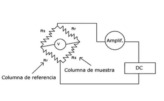 (Para interesados en la electrónica): ¿Cómo se mide la resistencia eléctrica? Con un diseño sencillo y muy conocido por los electricistas y electrónicos: el Puente de Wheatstone, en el que una resistencia eléctrica tiene un valor desconocido, y el resto tiene valores conocidos. Los viejos TCD tenían dos filamentos: por uno pasaba el gas carrier puro, y por el otro, el gas con el posible analito. Por comparación, el circuito calculaba el valor de la resistencia eléctrica del segundo filamento.