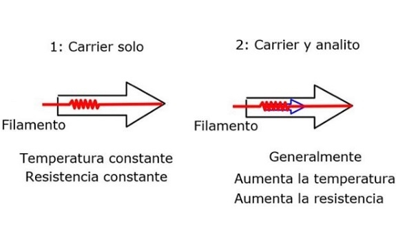 Contiene un filamento de Tungsteno, por el que está pasando permanentemente el gas carrier (por ejemplo, Hidrógeno). Cuando por la columna eluye con el carrier un analito, el filamento va a estar más caliente, dado que cualquier sustancia posee una conductividad térmica menor que el Hidrógeno (que es el gas que mejor transmite el calor)**. Dicho de otra manera, ninguna sustancia va a disipar tan bien el calor como este gas carrier, por lo que el filamento se va a calentar.