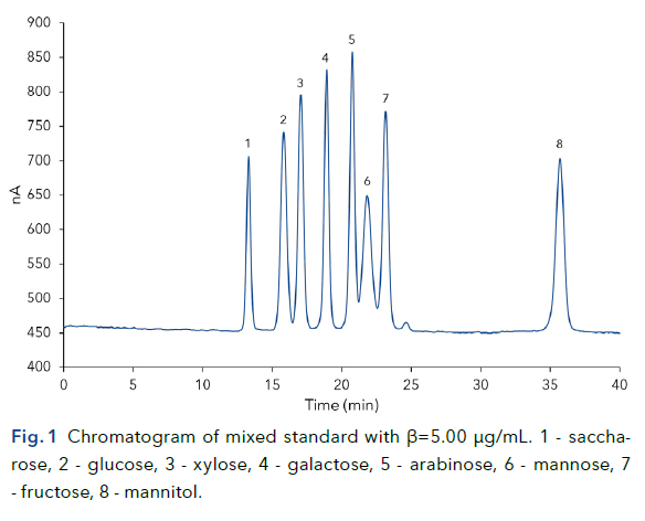 Se preparó una curva de calibración de cinco puntos para los ocho carbohidratos de 0,35 µg/mL a 5,00 µg/mL. Todas las curvas de calibración mostraron una buena linealidad, con un coeficiente de correlación de R2 > 0,9999. La Fig. 1 muestra el cromatograma de un patrón mixto a una concentración de β=5,00 µg/mL.